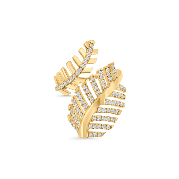 This yellow gold ring wraps around your finger like soft palm leaves, all covered in sparkling diamonds.
