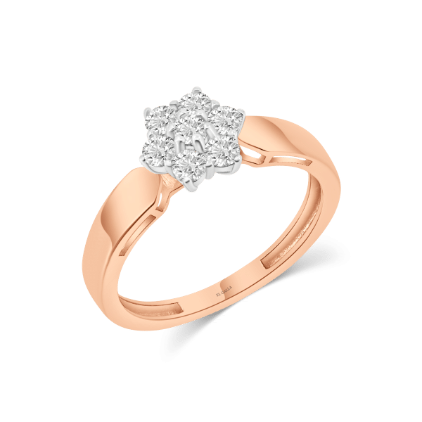 This rose gold ring features a starflower-shaped diamond cluster at the center. With its smooth, wide band, it’s a modern piece full of sparkle and charm.