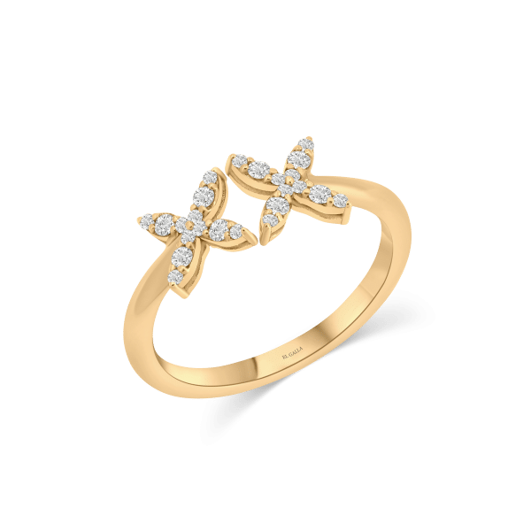This yellow gold ring features two diamond-covered butterflies in an open design, adding a light, elegant touch and a flutter of sparkle to your look.