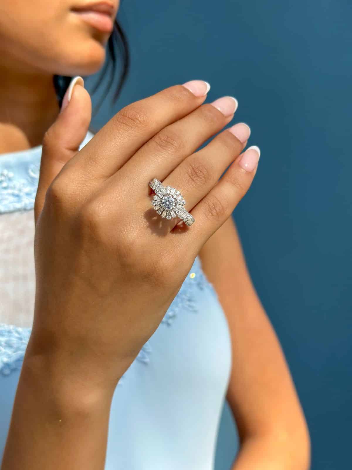This stunning engagement ring features a radiant halo of baguette diamonds, creating a captivating sparkle. The intricate setting and unique band design add elegance to the piece.