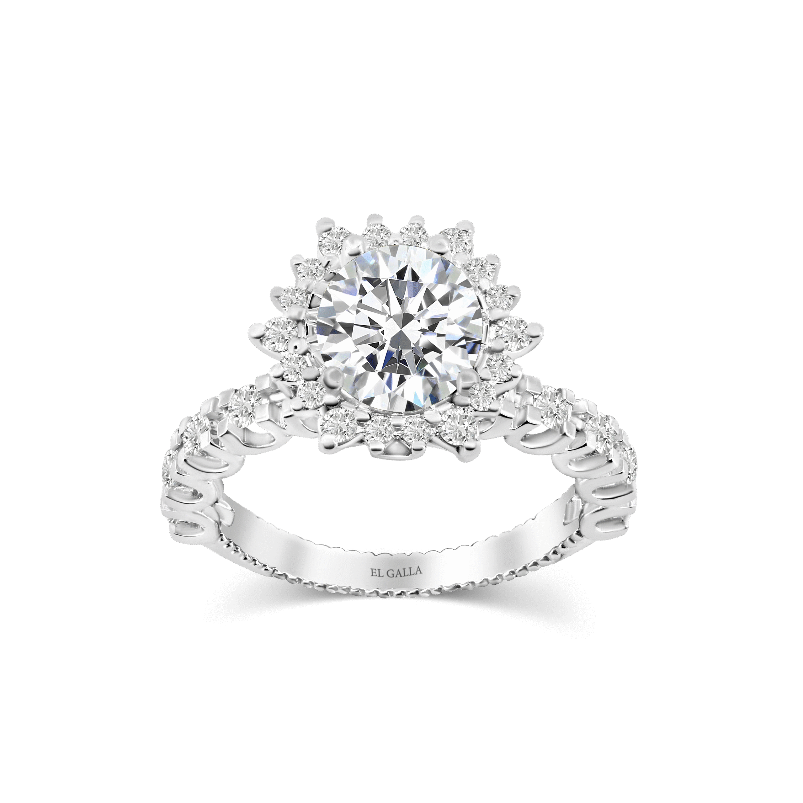 This stunning engagement ring features a dazzling halo of melee diamonds for a captivating and elegant look. Intricate band details add vintage charm, making it a timeless choice for unforgettable proposal.