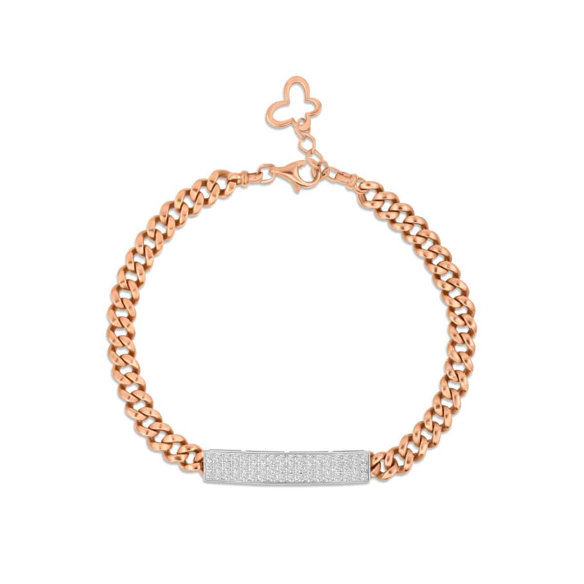 A polished rose-gold curb chain features a sleek rectangular bar paved with sparkling round diamonds, combining modern edge with refined shine.