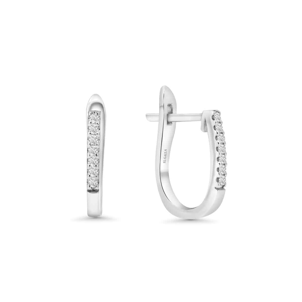 Sleek white-gold huggie hoops featuring a gently curved bar set with sparkling round diamonds for a modern, minimalist look.