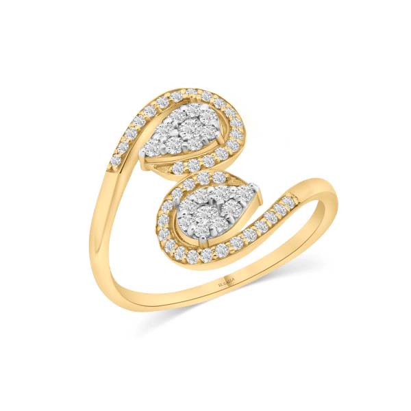 This ring features two pear-shaped diamond clusters on a smooth yellow gold band. With its elegant swirl design, it adds a soft, graceful touch of sparkle.